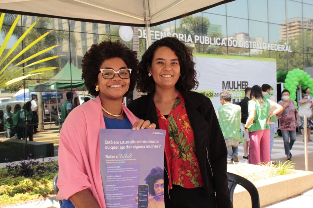 Como resultado dessas primeiras articulações, Mari Leal (gerente de projetos d’AzMina) e Débora Vasconcellos (assistente de projetos) estiveram em Brasília, onde foi firmado um termo de cooperação com a Defensoria Pública do Distrito Federal (DPDF). A parceria já gerou uma série de atividades conjuntas, entre elas a participação em eventos organizados pelo NUDEM da DPDF e a gravação de um episódio do podcast Vozes Entrelaçadas.